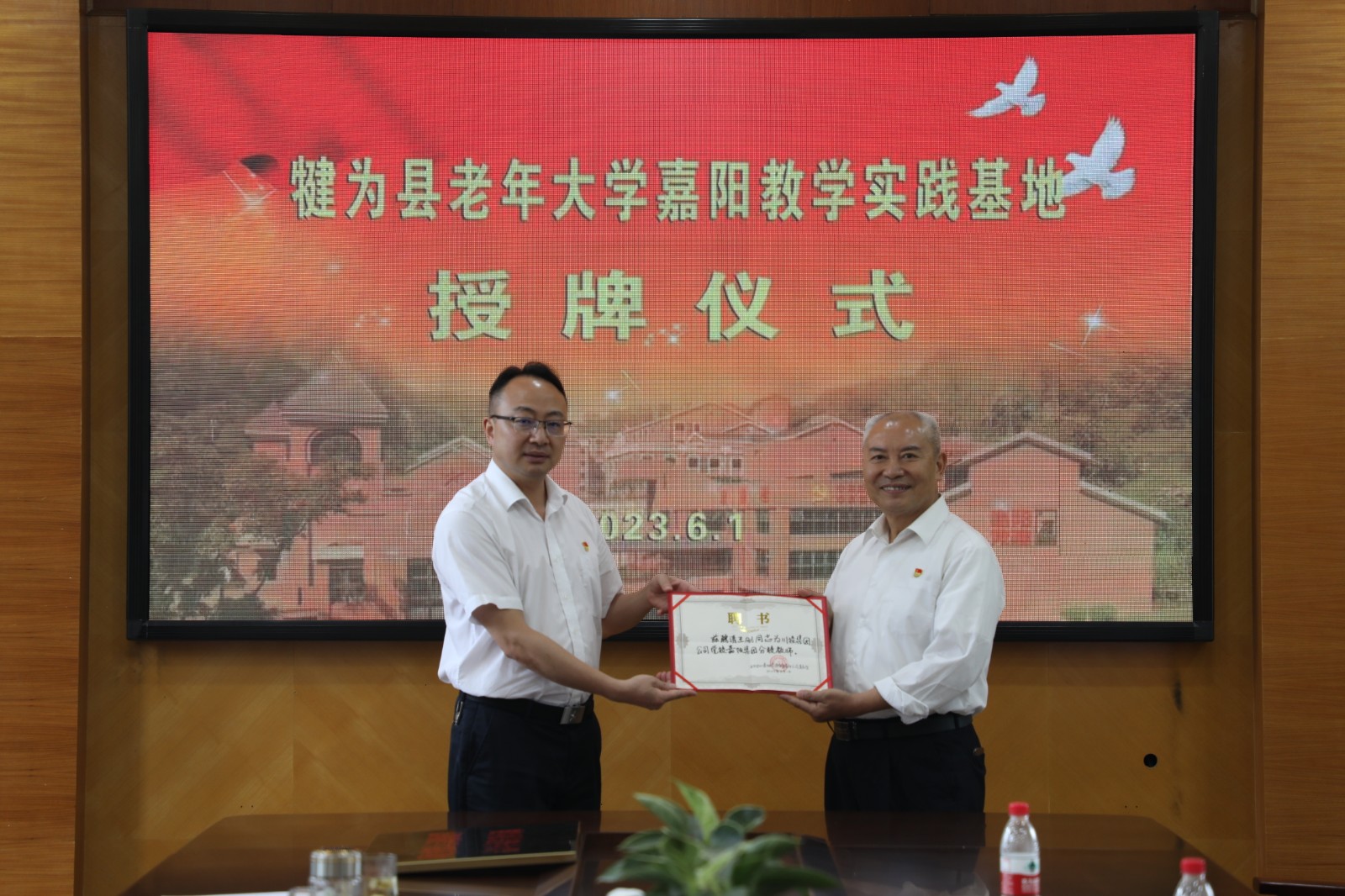 犍为县卫生健康局机关党委书记杨建授牌;嘉阳集团党委副书记、工会主席谢建国向县老年大学常务副校长、公司退休职工王刚颁发党校教师聘书。双方围绕挖掘文化、加强交流、组织活动、促进党校建设和转型发展等课题深入开展座谈交流。