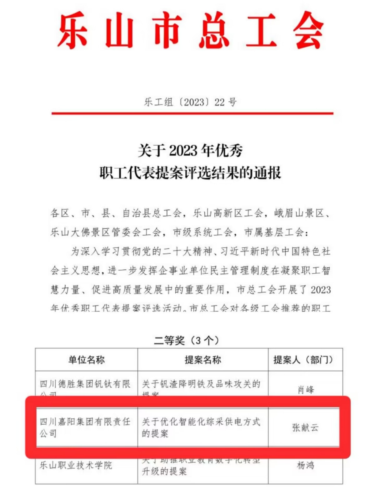 日前,嘉阳煤矿采煤二队技术员张献云在乐山市总工会开展的2023年优秀职工代表提案评选活动中斩获二等奖,集团工会获得优秀组织奖。