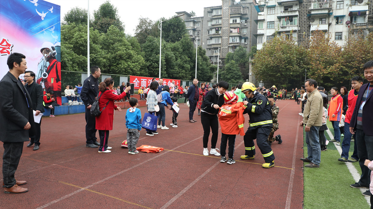 运动会设灭火器负重接力、速度之争、生命传递、紧急逃生、水枪水带连接出水五个项目。首先开始的是灭火器负重接力,当队员听到裁判员的开始哨音后,每队一名队员拿上4KG干粉灭火器绕足球场一圈后,交由第二名队员接力,直到最后一名队员回到终点。速度之争准备2套灭火战斗防护服,2套小朋友消防服,爸爸全副武装穿戴好战斗服后跑到妈妈所在位置,然后背起妈妈到达小朋友所在位置,爸爸妈妈一起将小朋友穿戴好消防服后,共同抬送至终点。生命传递模拟火场中救人的情景,16名家长分成2队,家长们躺在草地上,手臂举高,孩子躺在家长的手上,家长们运用手臂的力量将各自队伍的小朋友运送至终点。紧急逃生将消防逃生和游戏有效融合,模拟遇到火灾疏散逃生的情景,在草地上铺设40公分高的球网,家长和小朋友依次匍匐通过球网。水枪水带连接出水是队员听到裁判员开始哨音后,将两盘水带、消防水管、直流水枪逐一连接,在队员做出喷水动作后,消防栓处的同伴开水,当水从水枪口喷出打中目标后结束。经过一个半小时的紧张角逐,运动会圆满落下帷幕。