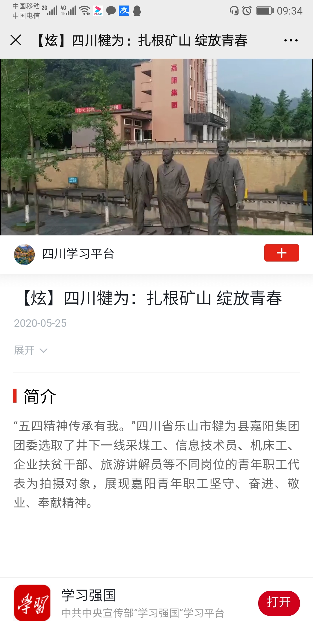 “看,咱嘉阳上‘学习强国’平台了!”由嘉阳集团团委组织拍摄的短视频“燃烧的青春”亮相‘学习强国’四川平台,短视频迅速在朋友圈刷屏成为热议话题。