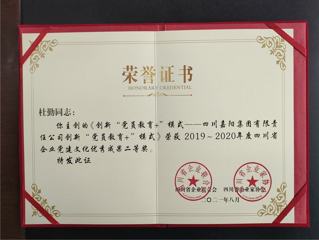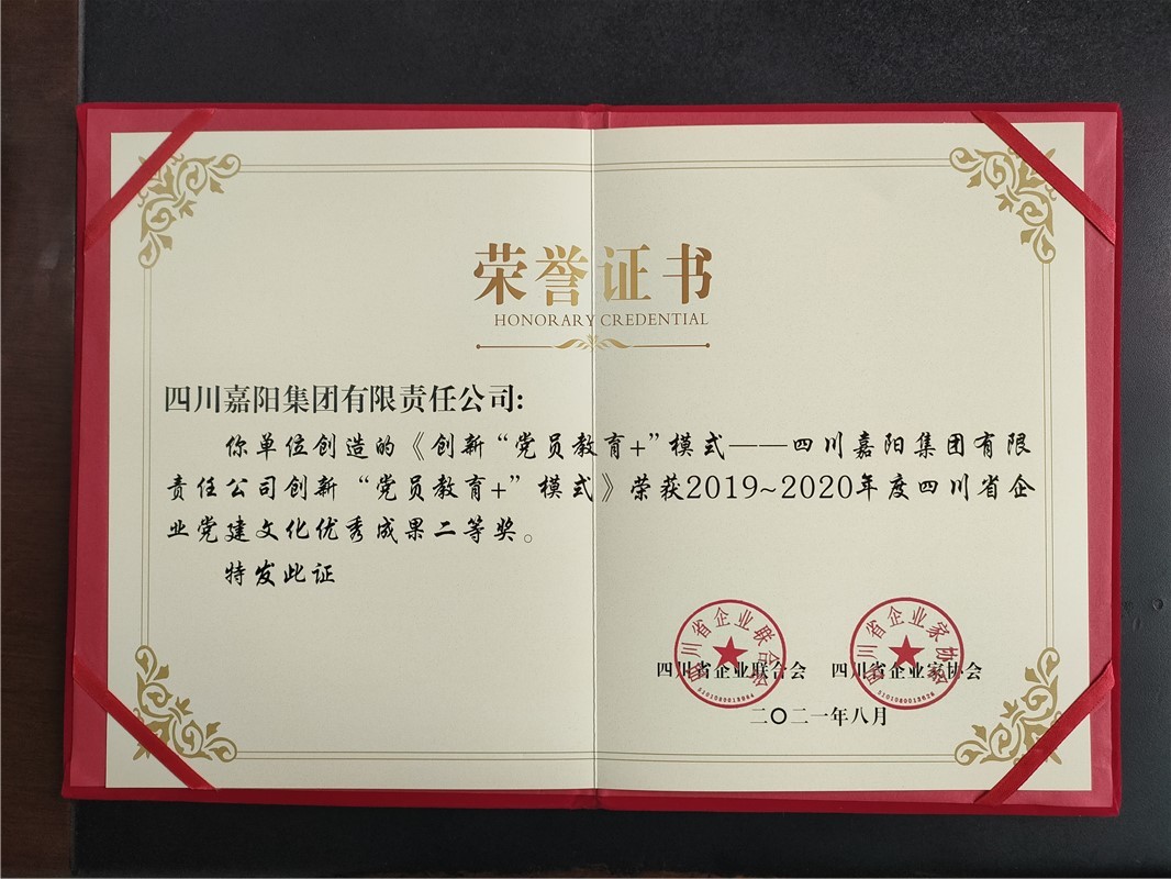 党建引领,文化铸魂,嘉阳集团多年来在党建文化领域深耕细作,成绩斐然。四川省企业联合会、四川省企业家协会联合开展2019—2020年度四川省企业文化建设优秀成果评选活动,嘉阳集团以《创新“党员教育+”模式》为题参选,主创人为党委书记、董事长杜勤、川投峨旅党总支副书记袁成方,参创人为党委副书记谢建国。通过申报、推荐、初评、专家评审等相关程序,嘉阳集团在众多企业中脱颖而出,荣获四川省企业党建文化优秀成果二等奖。嘉阳集团将再接再厉,进一步加强党建文化建设,促进企业实现高质量发展。